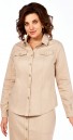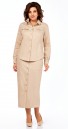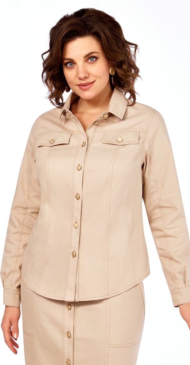 Комплект в стиле «Деним». Рубашка средней длины, полуприлегающего силуэта, воротник на стойке, застежка на пуговицы-кнопки по планке. Впереди кокетки, клапаны с пуговицами и по два рельефа на полочках. По спинке кокетка, клапан с пуговицей и по два рельефа с обеих сторон, низ рубашки закруглен. Рукав длинный, притачная манжета на пуговице. Линия притачивания подчеркнуты строчками на двухигольной машине слегка в контраст ткани.