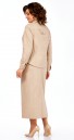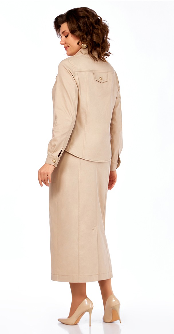 Юбка прямая, длина миди, оформлена притачным поясом (по бокам резинки), впереди застежка по планке на пуговицы-кнопки. У кокетки – вертикальные рельефы, накладные карманы (с боковым входом и притачными деталями) ограничены рельефными линиями и боковым швом. На заднем полотнище – кокетка, клапаны с пуговицами, рельефные линии, центральный шов и шлица. Линии притачивания подчеркнуты строчками на двухигольной машинке.