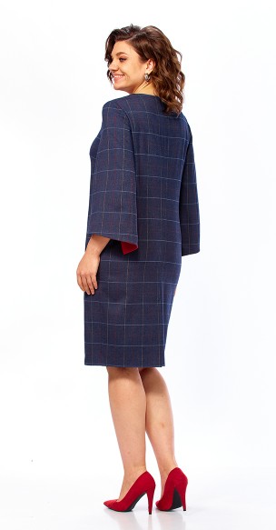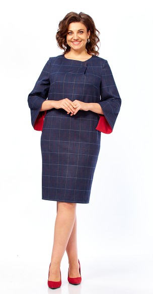 Платье полуприлегающего силуэта, выполнено из костюмно-плательной ткани. Платье с карманами, сзади шлица. У выреза горловины заложена складка, закрепленная лейбой, это создает эффектную асимметрию, подчеркнутую изнутри яркой обтачкой. Рельефные линии от проймы + вытачки, по линии рельефов-внутренние карманы. По спинке - шов, застежка «молния» и шлица. Рукав 3/4 , расширен к низу, ассиметричный срез подчеркнут яркой обтачкой.